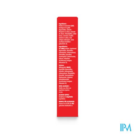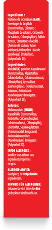 Wei (MELK) proteïne, Capsulewand (Hypromellose, Kleurstoffen: Calciumfosfaat, Calciumcarbonaat, Chlorofylline), Ijzersulfaat, Zuurteregelaars: (Natriumacetaat, Azijnzuur, Antioxidant: Ascorbinezuur) Emulgator: (Polysorbaat20)