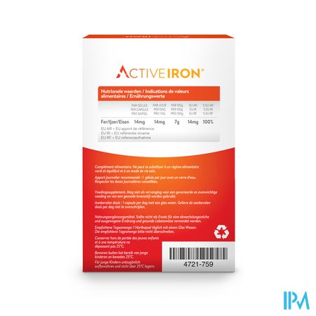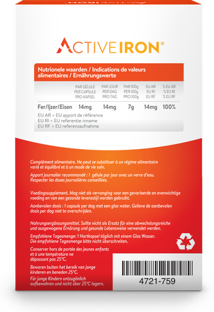 Active Iron 14mg Caps 30 Nf is een voedingssupplement, verkrijgbaar in uw buurtapotheek of online apotheek. Neem niet meer dan de aanbevolen dagelijkse dosis vermeld op de verpakking. Het vervangt geen gezonde levensstijl en gevarieerde en evenwichtige voeding. Vraag raad aan uw apotheker. Het product altijd buiten het bereik van kinderen houden.