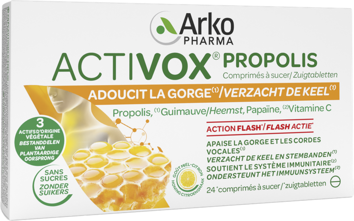 Activox® Pastilles, zuigpastilles om de keel te verzachten dankzij de verzachtende eigenschappen van heemst. Ze bevatten ook propolis die het immuunsysteem ondersteunt en de weerstand verhoogt. Vitamine C, ook aanwezig in deze pastilles, draagt bij tot de goede werking van het afweersysteem van het lichaam.