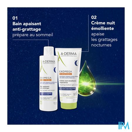 De meest complete avondroutine: 1. Voeg het Soothing Bath toe aan uw badwater, een aanvullende behandeling om u te kalmeren en voor te bereiden op de slaap. 2. Wassen met 2-in-1 reinigingsgel voor hygiëne aangepast aan de droge atopie huid. 3. Breng de verzachtende herstellende nachtcrème aan om de jeuk te laten slapen.