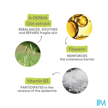 • DRIEVOUDIGE VERZACHTENDE WERKING dankzij Rhealba® Haverplantextract versterkt door BIOVECT, een natuurlijke vector: kalmeert de jeuk, vermindert roodheid en spreidt irritatiepieken. • VOEDING: maakt de huid minder droog en versterkt de huidbarrière dankzij Filaxerin, Vitamine B3 en de verzachtende kern van de formule. • MICROBIOOM: Rhealba® Haverplantextract helpt het microbioom weer in balans te brengen.