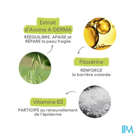 • DRIEVOUDIGE VERZACHTENDE WERKING dankzij Rhealba® Haverplantextract versterkt door BIOVECT, een natuurlijke vector: kalmeert de jeuk, vermindert roodheid en spreidt irritatiepieken. • VOEDING: maakt de huid minder droog en versterkt de huidbarrière dankzij Filaxerin, Vitamine B3 en de verzachtende kern van de formule. • MICROBIOOM: Rhealba® Haverplantextract helpt het microbioom weer in balans te brengen