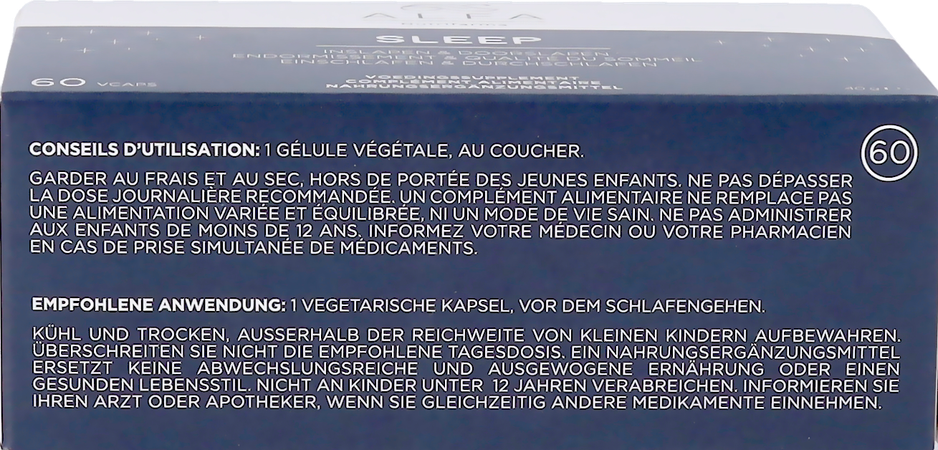Alfa Sleep V-caps 60 is een voedingssupplement, verkrijgbaar in uw buurtapotheek of online apotheek. Neem niet meer dan de aanbevolen dagelijkse dosis vermeld op de verpakking. Het vervangt geen gezonde levensstijl en gevarieerde en evenwichtige voeding. Vraag raad aan uw apotheker. Het product altijd buiten het bereik van kinderen houden.