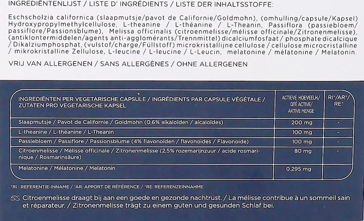 • efficiënte combinatie van rustgevende planten met toevoeging van lichaamseigen slaaphormoon melatonine