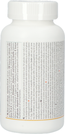 Calcium carbonat; verdikkingsmiddel: microcristallinecellulose; calcium citrate; calcium ascorbat; omhullingsmiddel: hydroxypropylmethylcellulose; glijmiddel: magnesiumzouten van vetzuren; anti-agglomeraat: silicium dioxide; emulgator: carboxymethylcellulose; vitamine K2 (MK7, Natto); vitamine D2 ergocalciferol (plantaardig).