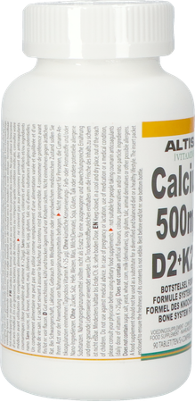 Altisa Calcium 500mg + Vit.d2 + Vit.k2 Pot Tabl 90 is een voedingssupplement, verkrijgbaar in uw buurtapotheek of online apotheek. Neem niet meer dan de aanbevolen dagelijkse dosis vermeld op de verpakking. Het vervangt geen gezonde levensstijl en gevarieerde en evenwichtige voeding. Vraag raad aan uw apotheker. Het product altijd buiten het bereik van kinderen houden.