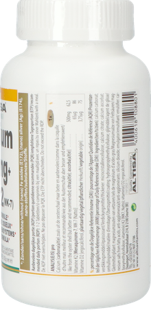 Dit Altisa calciumpreparaat, bedoeld voor de instandhouding van een normaal en sterk botstelsel, is een bron van calcium identiek aan het calcium uit de oesterschelp (calcium carbonaat) doch waarbij de bron oesterschaal vermeden wordt . In combinatie met vitamine K2 (menaquinon, ook wel MK-7 of Natto genoemd) en vitamine D2 (ergocalciferol) waarborgt dit supplement een maximale opname van het calcium.
