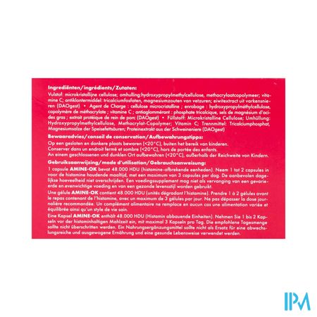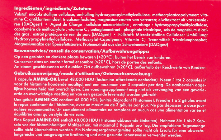 Amine-OK® is een voedingssupplement dat het enzym diamine oxidase, beter gekend als DAO bevat. Dit is een stof die van nature in het lichaam voorkomt en betrokken is bij de afbraak van histamine uit voedingsmiddelen.