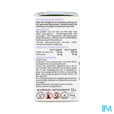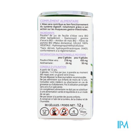 Sap poeder* van het blad van BIO Aloe Vera (Aloe barbadensis) - Verdikkingsmiddel: BIO Acaciagom - BIO maïszetmeel - BIO Appelvezels (Malus domestica). CAPSULE 100% PLANTAARDIG: Hydroxypropylmethylcellulose.