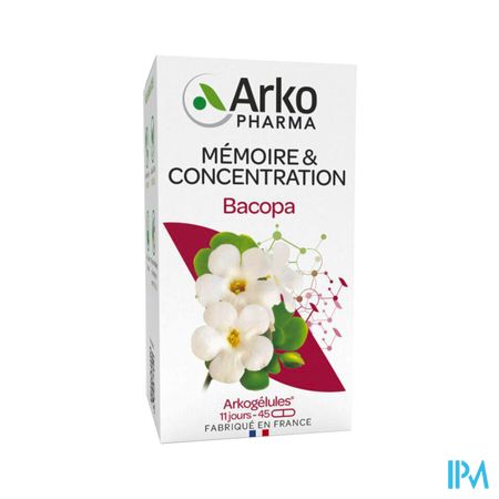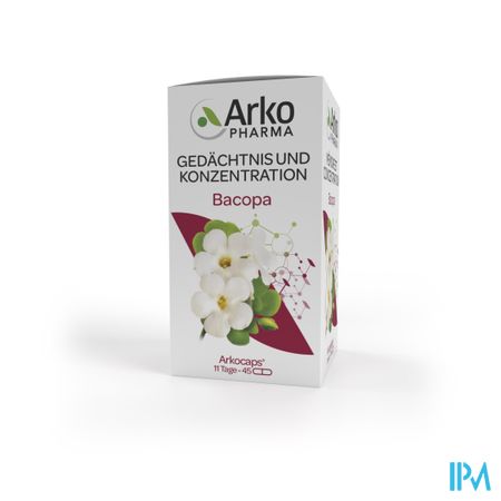 Arkocaps Bacopa Plantaardig 45 is een voedingssupplement, verkrijgbaar in uw buurtapotheek of online apotheek. Neem niet meer dan de aanbevolen dagelijkse dosis vermeld op de verpakking. Het vervangt geen gezonde levensstijl en gevarieerde en evenwichtige voeding. Vraag raad aan uw apotheker. Het product altijd buiten het bereik van kinderen houden.