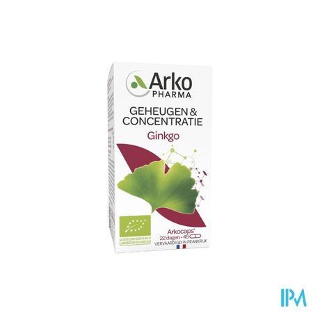 Arkocaps Ginkgo Bio Caps 45 is een voedingssupplement, verkrijgbaar in uw buurtapotheek of online apotheek. Neem niet meer dan de aanbevolen dagelijkse dosis vermeld op de verpakking. Het vervangt geen gezonde levensstijl en gevarieerde en evenwichtige voeding. Vraag raad aan uw apotheker. Het product altijd buiten het bereik van kinderen houden.