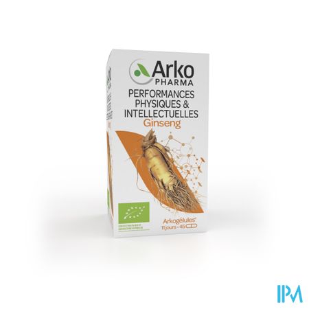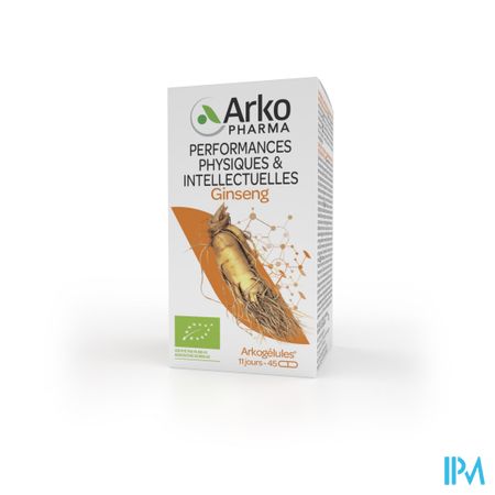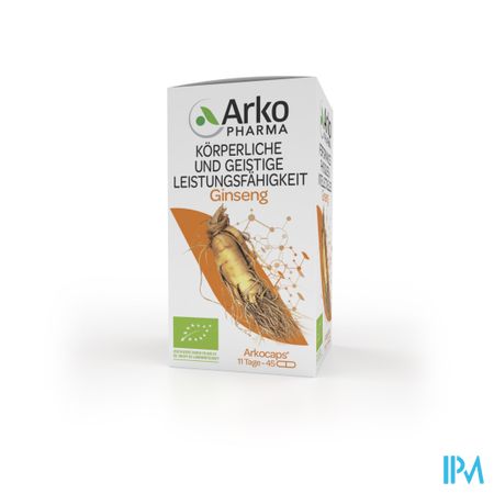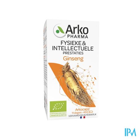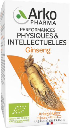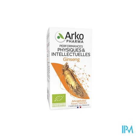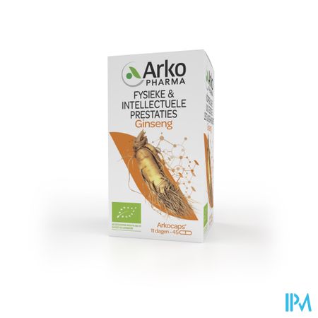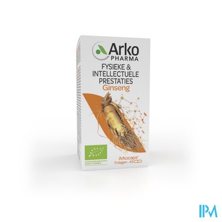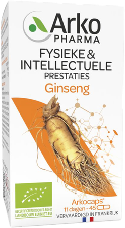 Arkocaps Ginseng Bio Caps 45 is een voedingssupplement, verkrijgbaar in uw buurtapotheek of online apotheek. Neem niet meer dan de aanbevolen dagelijkse dosis vermeld op de verpakking. Het vervangt geen gezonde levensstijl en gevarieerde en evenwichtige voeding. Vraag raad aan uw apotheker. Het product altijd buiten het bereik van kinderen houden.