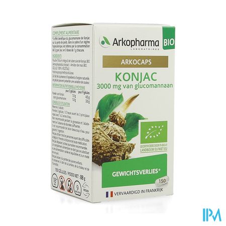Arkocaps Konjac Bio Caps 150 Nf is een voedingssupplement, verkrijgbaar in uw buurtapotheek of online apotheek. Neem niet meer dan de aanbevolen dagelijkse dosis vermeld op de verpakking. Het vervangt geen gezonde levensstijl en gevarieerde en evenwichtige voeding. Vraag raad aan uw apotheker. Het product altijd buiten het bereik van kinderen houden.