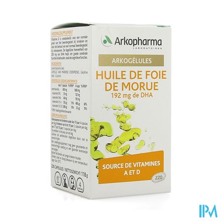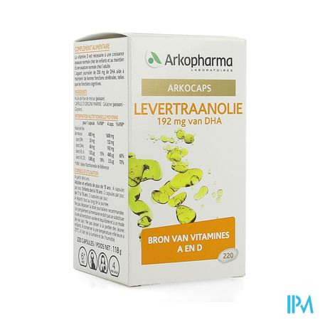 Arkocaps Levertraanolie Caps 220 Arkopharma is een voedingssupplement, verkrijgbaar in uw buurtapotheek of online apotheek. Neem niet meer dan de aanbevolen dagelijkse dosis vermeld op de verpakking. Het vervangt geen gezonde levensstijl en gevarieerde en evenwichtige voeding. Vraag raad aan uw apotheker. Het product altijd buiten het bereik van kinderen houden.
