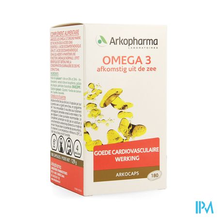 Arkocaps Omega 3 Uit De Zee 180 is een voedingssupplement, verkrijgbaar in uw buurtapotheek of online apotheek. Neem niet meer dan de aanbevolen dagelijkse dosis vermeld op de verpakking. Het vervangt geen gezonde levensstijl en gevarieerde en evenwichtige voeding. Vraag raad aan uw apotheker. Het product altijd buiten het bereik van kinderen houden.