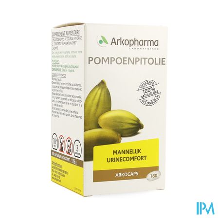 Arkocaps Pompoenpitolie Caps 180 is een voedingssupplement, verkrijgbaar in uw buurtapotheek of online apotheek. Neem niet meer dan de aanbevolen dagelijkse dosis vermeld op de verpakking. Het vervangt geen gezonde levensstijl en gevarieerde en evenwichtige voeding. Vraag raad aan uw apotheker. Het product altijd buiten het bereik van kinderen houden.