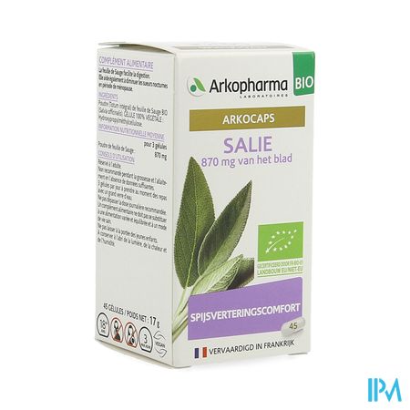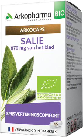Arkocaps Salie Bio Caps 45 Nf is een voedingssupplement, verkrijgbaar in uw buurtapotheek of online apotheek. Neem niet meer dan de aanbevolen dagelijkse dosis vermeld op de verpakking. Het vervangt geen gezonde levensstijl en gevarieerde en evenwichtige voeding. Vraag raad aan uw apotheker. Het product altijd buiten het bereik van kinderen houden.