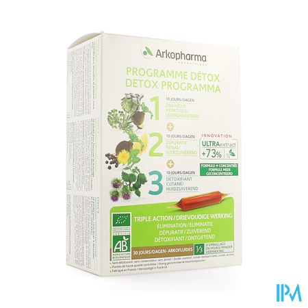 Arkofluide Programma Detox Amp 30 is een voedingssupplement, verkrijgbaar in uw buurtapotheek of online apotheek. Neem niet meer dan de aanbevolen dagelijkse dosis vermeld op de verpakking. Het vervangt geen gezonde levensstijl en gevarieerde en evenwichtige voeding. Vraag raad aan uw apotheker. Het product altijd buiten het bereik van kinderen houden.