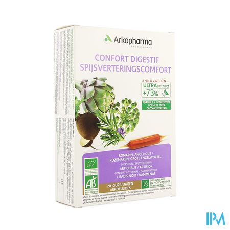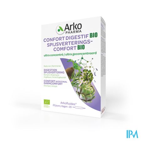 Arkofluide Spijsverteringcomfort Bio Amp 20 is een voedingssupplement, verkrijgbaar in uw buurtapotheek of online apotheek. Neem niet meer dan de aanbevolen dagelijkse dosis vermeld op de verpakking. Het vervangt geen gezonde levensstijl en gevarieerde en evenwichtige voeding. Vraag raad aan uw apotheker. Het product altijd buiten het bereik van kinderen houden.