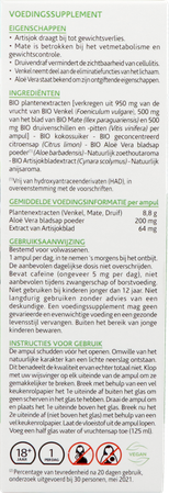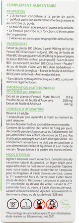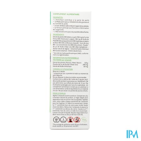 BIO plantenextract [verkregen uit 950 mg BIO Venkelfruit (Foeniculum vulgare), 500 mg BIO Mateblad (Ilex paraguariensis) en 500 mg BIO Druivenschil en zaden (Vitis vinifera) per ampul] – Suiker biologische kokosnoot – Geconcentreerd biologisch citroensap (Citrus limon) – Poeder* van biologisch Aloë vera-bladsap (Aloë barbadensis) – Natuurlijke zoethoutsmaak – Biologisch artisjokbladextract (Cynara scolymus) – Natuurlijk anijsaroma.