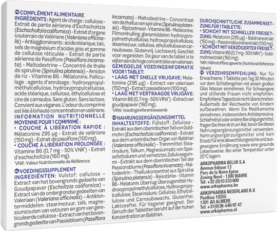 Vulstof: cellulose - Extract van het bovengronds gedeelte van Goudpapaver (Elscholtzia californica Cham.) - Extract van de ondergrondse gedeelten van Valeriaan (Valeriana officinalis L.) - Antiklontermiddelen: stearinezuur, talk, magnesiumstearaat en gom van gereticuleerde cellulose - Extract van het bovengronds gedeelte van de Passiebloem (Passiflora Incarnata L.) - Maltodextrine - Concentraat van de thallus van spiruline (Spirulina platensis (Gomont) Geitler) - Rijstzetmeel - Vitamine B6 - Melatonine.