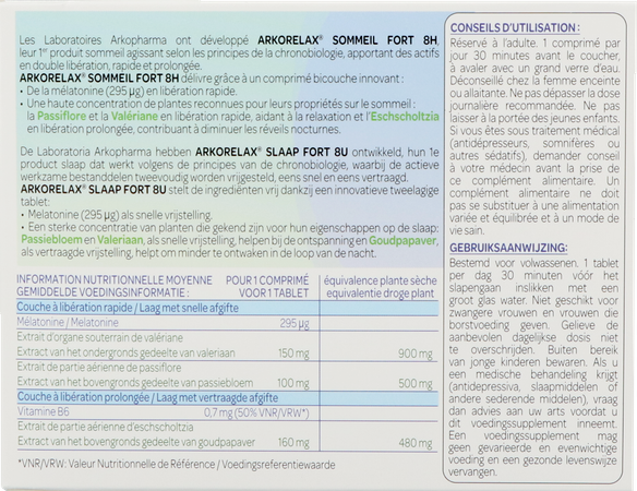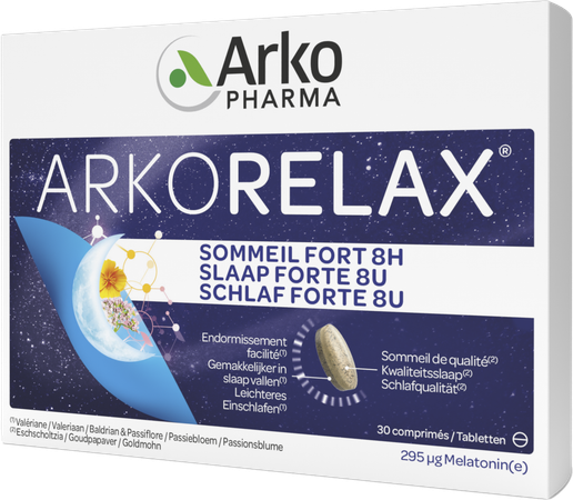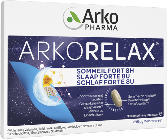 Arkorelax® Slaap Fort 8U is een voedingssupplement op basis van Melatonine, Plantenextracten en Vitamine B6. ARKORELAX® SLAAP FORT 8U garandeert u een volledige nacht dankzij zijn innovatieve formule aan melatonine met snelle en vertraagde vrijstelling en hoog geconcentreerd aan extracten van planten die gekend zijn voor hun eigenschappen op de slaap. Dit product veroorzaakt geen enkele bijwerking en geen slaperigheid bij het ontwaken.