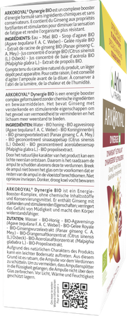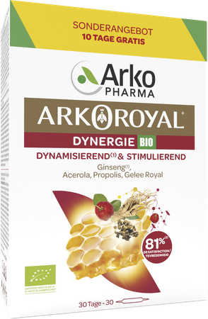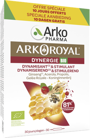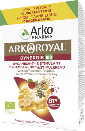 ARKOROYAL® Dynergie BIO is een voedingssupplement met Ginseng, Koninginnenbrij, Acerola en Propolis.