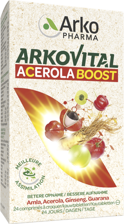 Arkovital Acerola Boost Kauwtabl 24 is een voedingssupplement, verkrijgbaar in uw buurtapotheek of online apotheek. Neem niet meer dan de aanbevolen dagelijkse dosis vermeld op de verpakking. Het vervangt geen gezonde levensstijl en gevarieerde en evenwichtige voeding. Vraag raad aan uw apotheker. Het product altijd buiten het bereik van kinderen houden.