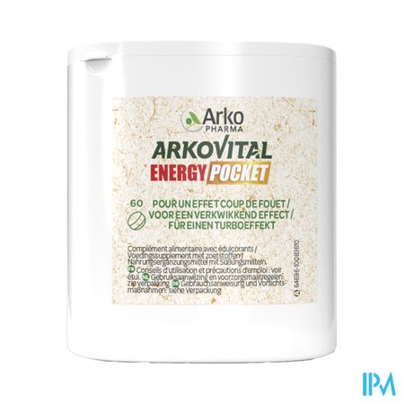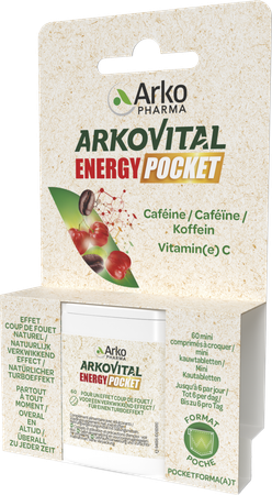 Arkovital Energy Pocket Tabl 60 is een voedingssupplement, verkrijgbaar in uw buurtapotheek of online apotheek. Neem niet meer dan de aanbevolen dagelijkse dosis vermeld op de verpakking. Het vervangt geen gezonde levensstijl en gevarieerde en evenwichtige voeding. Vraag raad aan uw apotheker. Het product altijd buiten het bereik van kinderen houden.