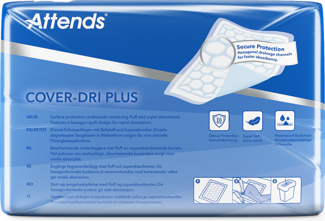 Attends Cover-Dri Plus is een assortiment beschermende onderleggers en kunnen worden gebruikt bij Licht tot Matig urine incontinentie. Attends Cover-Dri hebben een zeshoekige patroon met absorberende "kussentjes" gevuld met Superabsorberende korrels. Het vocht zal zich snel en efficiënt verspreiden vanwege de tussenliggende kanaaltjes en veilig worden opgenomen waardoor de onderleggers droger en uiterst comfortabel zijn. Rol de onderlegger na gebruik op en deponeer deze in de daarvoor bestemde milieu- of verwijderingsbak. U kunt erop vertrouwen dat uw oppervlaktes beschermd en droog zijn.