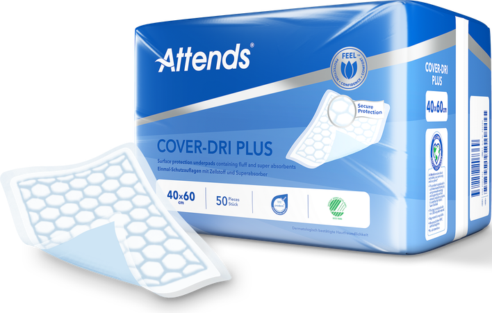 Attends Cover-Dri Plus is een assortiment beschermende onderleggers en kunnen worden gebruikt bij Licht tot Matig urine incontinentie.