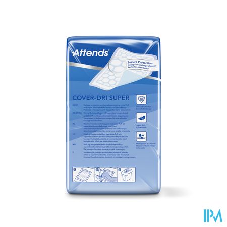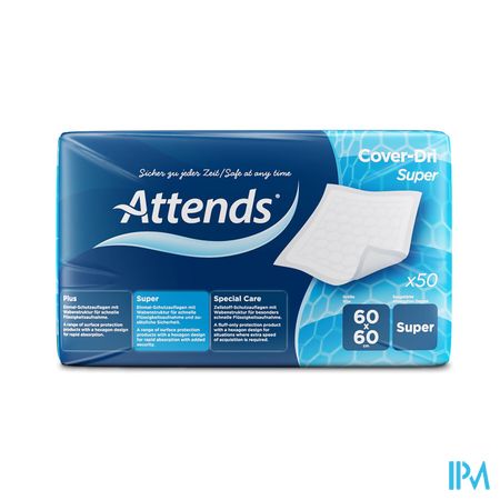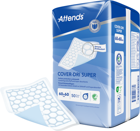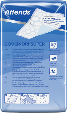 Attends Cover-Dri Plus is een assortiment beschermende onderleggers en kunnen worden gebruikt bij Licht tot Matig urine incontinentie. Attends Cover-Dri hebben een zeshoekige patroon met absorberende "kussentjes" gevuld met Superabsorberende korrels. Het vocht zal zich snel en efficiënt verspreiden vanwege de tussenliggende kanaaltjes en veilig worden opgenomen waardoor de onderleggers droger en uiterst comfortabel zijn. Rol de onderlegger na gebruik op en deponeer deze in de daarvoor bestemde milieu- of verwijderingsbak. U kunt erop vertrouwen dat uw oppervlaktes beschermd en droog zijn.