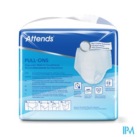 Attends Pull-Ons 6 XL is een zachte en discrete broek die aanvoelt als ondergoed. De wegwerpbroekjes kunnen gemakkelijk op en neer worden getrokken en zijn ontworpen om matige tot Zwaar incontinentie te beheersen. Attends Pull-Ons zorgen voor een superieure pasvorm voor extra comfort. De sterk absorberende kern beschermt tegen lekkage en geurtjes, voor een actief leven met een veilig gevoel.
