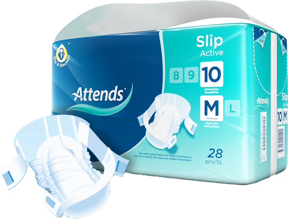 Attends Slip Active is ontworpen voor de gebruiker die een actief leven leiden en toch behoefte hebben aan een optimaal beschermend product bij zware incontinentie. Door de speciale fixatie en pasvorm is het product nauwelijks waarneembaar onder normale kleding doordat de slip perfect aansluit op het lichaam.