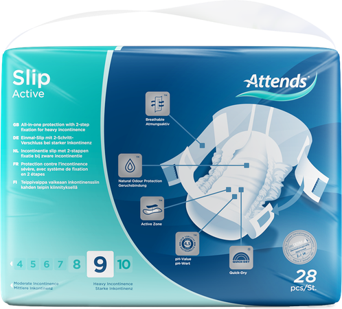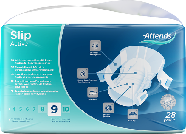 Attends Slip Active is ontworpen voor de gebruiker die een actief leven leiden en toch behoefte hebben aan een optimaal beschermend product bij zware incontinentie. Door de speciale fixatie en pasvorm is het product nauwelijks waarneembaar onder normale kleding doordat de slip perfect aansluit op het lichaam.