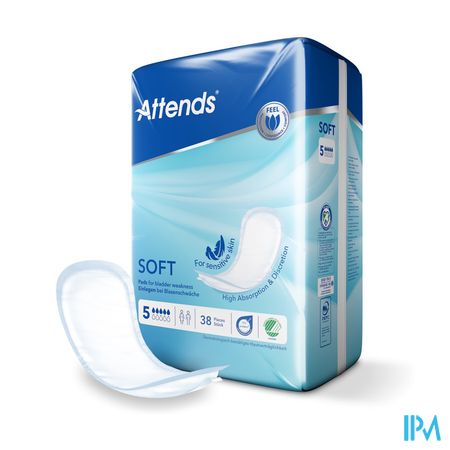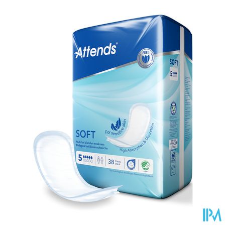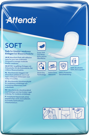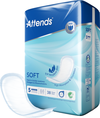 De nieuwe Attends Soft 4 en 5 zijn comfortabele, zachte en dunne inleggers. De producten hebben een natuurlijke pasvorm voor een perfecte aansluiting op het lichaam. De zachte, elastische beschermrandjes bieden extra zekerheid tegen lekkage.