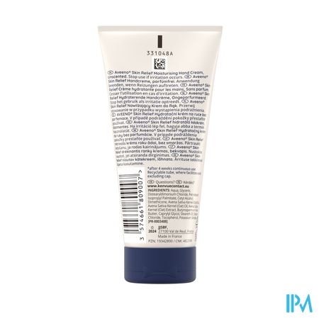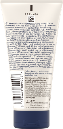 Aveeno® Skin Relief Hydraterende Handcrème hydrateert intensief en helpt de symptomen van zeer droge handen te verlichten. Het is klinisch bewezen dat de handcrème de beschermende huidbarrière herstelt en versterkt. De formule helpt ook de huid te beschermen tegen invloeden van buitenaf en ondersteunt de natuurlijke ceramideproductie van de huid. Aveeno® Skin Relief Hydraterende Handcrème helpt de symptomen van een zeer droge en trekkerige huid te verlichten en zorgt voor een gekalmeerde en gehydrateerde huid. Van Aveeno® Hydraterende Handcrème met verzachtende haver- en karitéboter is klinisch bewezen dat de huid 72 uur lang intensief gehydrateerd wordt* en de handen gevoed laat aanvoelen, zelfs na het wassen. De prebiotische haver die de crème bevat, ondersteunt de groei van natuurlijke micro-organismen op de huid als onderdeel van de natuurlijke huidbarrière. De unieke formule van deze handcrème is geschikt voor de gevoelige huid en is ongeparfumeerd, niet vet, snel geabsorbeerd, hypoallergeen** en veganistisch°.
