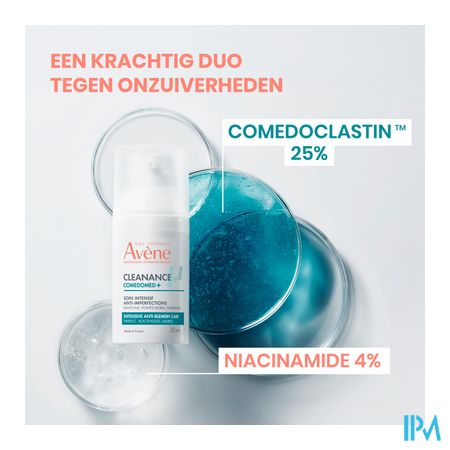 De formule bevat een hoge concentratie aan dermatologische actieve ingrediënten, met: - 25% Comedoclastin™** : met talgregulerende werking, vermindert oneffenheden. - 4% niacinamide: maakt poriën minder zichtbaar en vermindert acnevlekjes. Verrijkt met verzachtend Thermaal water van Avène.