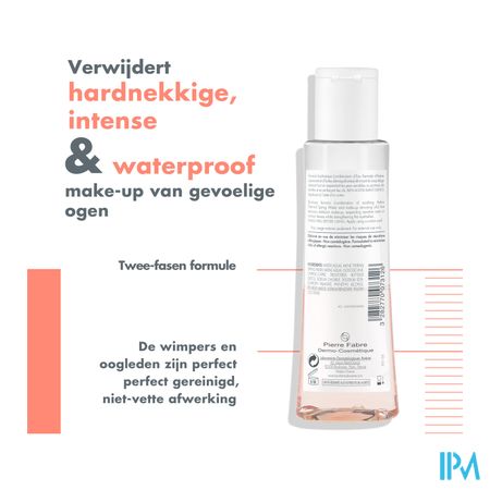 De tweefasen formule (een combinatie van verzachtend Thermaal Water van Avène en oliën die make-up helpen te verwijderen) en de isotone concentratie zorgen ervoor dat de huid efficiënte en comfortabele wijze ontdaan wordt van make-up. Deze intensieve oogmake-upremover voor gevoelige ogen is perfect geschikt voor mensen die contactlenzen dragen en verwijdert langhoudende, intense en waterproof make-up. De formule reinigt de wimpers en oogleden perfect en laat geen vettig laagje achter op de huid.