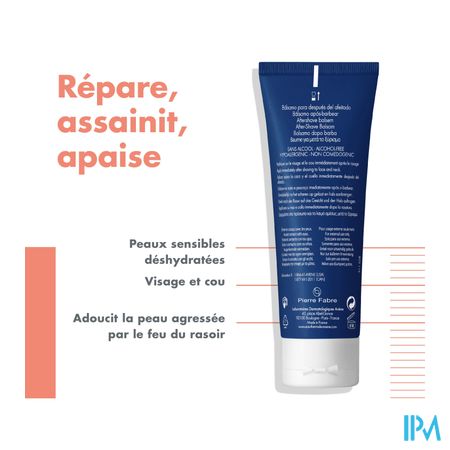 Deze aftershave balsem werkt zeer herstellend in op de huid en biedt haar optimaal comfort na de scheerbeurt. Het heeft een vochtinbrengende en verzachtende werking, perfect voor de gevoelige huid met neiging tot droogheid. De samenstelling op basis van Thermaal water van Avène met verzachtende en anti-irriterende eigenschappen zorgt biedt de huid na de scheerbeurt een gevoel van comfort. Het kalmeert de geïrriteerde huid na de scheerbeurt en beperkt het bacteriële risico als gevolg van kleine snijwondjes. Het vormt een zeer zacht en bijzonder hydraterend en huidherstellend laagje op de net geschoren huid om haar te kalmeren na de scheerbeurt. Zonder alcohol.