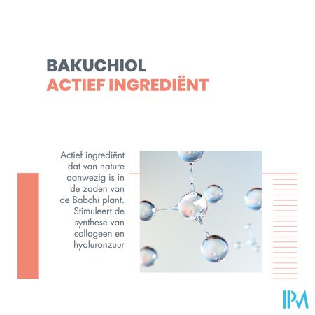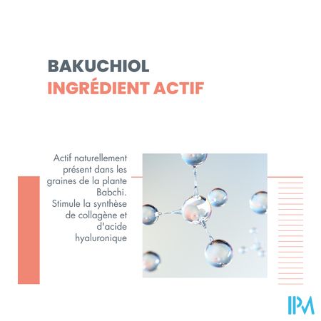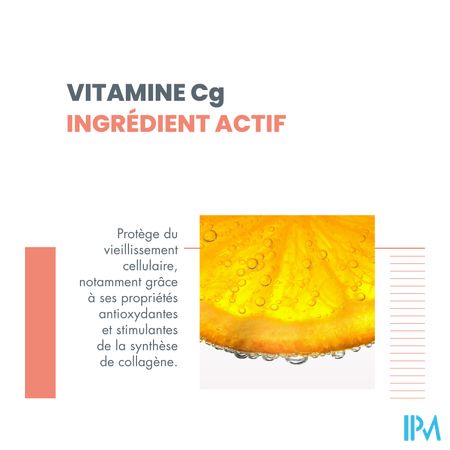 [VITAMINE Cg*] 1,8% : erkend om zijn antioxiderende werking die overeenkomt met die van 20% vitamine C** [NIACINAMIDE] 3%: regenereert de huid op lange termijn en vermindert ouderdomsvlekken [BAKUCHIOL] 1,5%: erkend als plantaardig alternatief voor retinol, strijkt rimpels weer glad