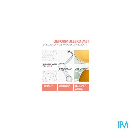 AVENE THERMAL SPRING WATER (AVENE AQUA). MINERAL OIL (PARAFFINUM LIQUIDUM). GLYCERIN. CAPRYLIC/CAPRIC TRIGLYCERIDE. PEG-12. OENOTHERA BIENNIS (EVENING PRIMROSE) OIL (OENOTHERA BIENNIS OIL). GLYCERYL STEARATE. MYRETH-3 MYRISTATE. PEG-100 STEARATE. POLYACRYLATE-13. AQUAPHILUS DOLOMIAE EXTRACT. ARGININE. CITRIC ACID. EVENING PRIMROSE OIL/PALM OIL AMINOPROPANEDIOL ESTERS. GLYCINE. POLYISOBUTENE. POLYSORBATE 20. SORBITAN ISOSTEARATE. TOCOPHEROL. WATER (AQUA)
