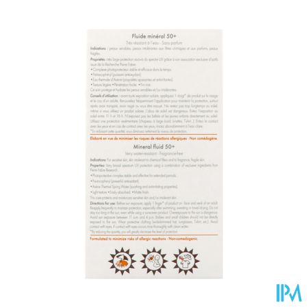 Het perfecte evenwicht tussen een zeer hoge UV-B- en UV-A-bescherming (zowel korte als lange stralen) en een perfecte tolerantie bij intolerante en allergische huidtypes die geen chemische filters en parfum verdragen. Een 100% minerale filter voor een zeer hoge en stabiele UVB- en UVA-bescherming. Provitamine E (pre-tocoferyl) met krachtige antioxiderende werking die de huidcellen beschermt tegen vrije radicalen. De vloeibare en lichte textuur hydrateert* de gevoelige en/of intolerante huid. De formule is verrijkt met het kalmerende en anti-irriterende Thermale Water van Avène en laat de huid dagelijks comfortabel aanvoelen. Deze krachtige zonnecrème met matte afwerking laat geen wit laagje achter, is niet geparfumeerd en bijzonder waterbestendig.