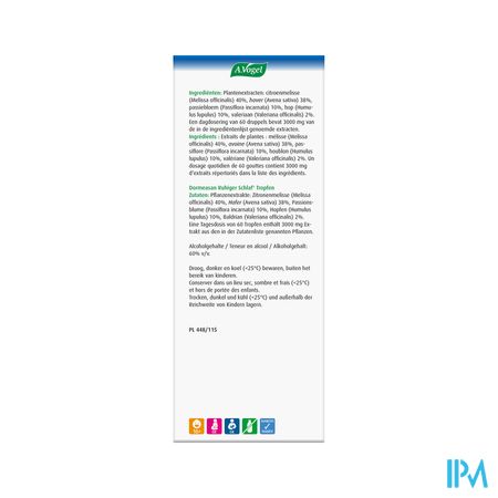 A.vogel Dormeasan Nachtrust Druppels 100ml is een voedingssupplement, verkrijgbaar in uw buurtapotheek of online apotheek. Neem niet meer dan de aanbevolen dagelijkse dosis vermeld op de verpakking. Het vervangt geen gezonde levensstijl en gevarieerde en evenwichtige voeding. Vraag raad aan uw apotheker. Het product altijd buiten het bereik van kinderen houden.