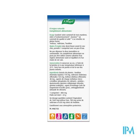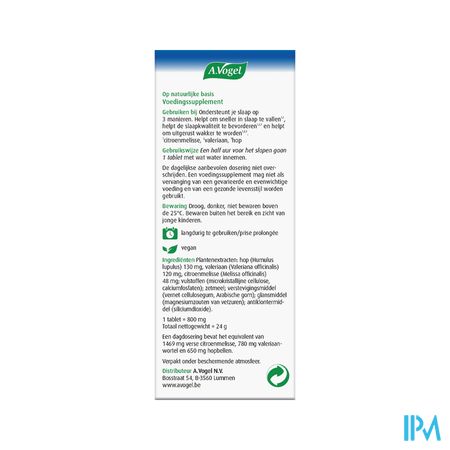 Plantenextracten: valeriaan (Valeriana officinalis), hop (Humulus lupulus), citroenmelisse 6% (Melissa officinalis), vulstoffen (cellulose, calciumfosfaten), zetmeel, verstevigingsmiddel (vernet cellulosegum; Arabische gom), glansmiddel (magnesiumstearaat; antiklontermiddel (siliciumdioxide).