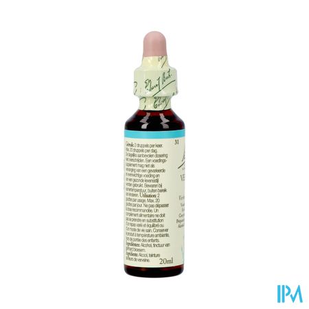 De originele formule volgens Dr. Edward Bach. Dit is een voedingssupplement-kruidenpreparaat. Een voedingssupplement mag niet als vervanging van een gevarieerde en evenwichtige voeding en van een gezonde levensstijl worden gebruikt. Bewaren bij kamertemperatuur, buiten bereik van kinderen.