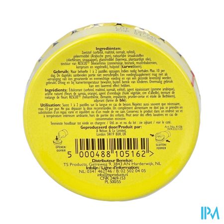 Zoetstoffen (sorbitol, maltitol, isomalt, xylitol), geleermiddel (Arabische gom), zuurteregelaar (citroenzuur), natuurlijke smaakstoffen (vlierbessen, sinaasappel), glansmiddel (plantaardige olie, bijenwas), tinctuur van Rescue bloesemmix (zonneroosje, bosrank, reuzenbalsemien, kerspruim en vogelmelk), hulpstof tarwebloem. Kan sporen van gluten bevatten.