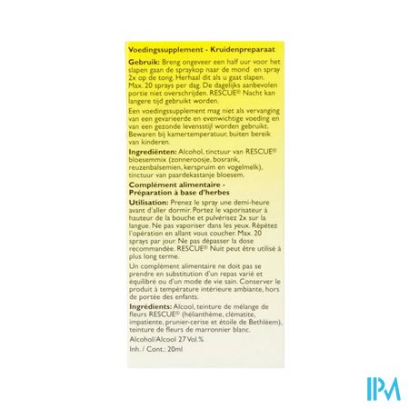 RESCUE® Nacht is beschikbaar in druppels 10ml en een handige spray van 7ml of 20 ml. Innemen voor het slapen gaan. Dit product is een originele formule van Edward Bach. De originele RESCUE® en Bach bloesem remedies uit Mount Vernon (UK), de woon- en werkplaats van Dr. Bach, herkent u aan de Bach handtekening.