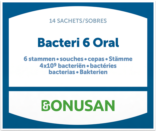 Bacteri 6 Oral Zakjes 14 Bonusan is een voedingssupplement, verkrijgbaar in uw buurtapotheek of online apotheek. Neem niet meer dan de aanbevolen dagelijkse dosis vermeld op de verpakking. Het vervangt geen gezonde levensstijl en gevarieerde en evenwichtige voeding. Vraag raad aan uw apotheker. Het product altijd buiten het bereik van kinderen houden.
