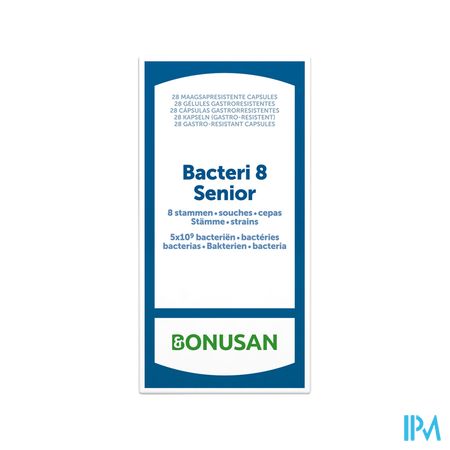 Bonusan Bacteri 8 Senior biedt een uitgebalanceerde mix van 8 bacteriestammen, speciaal geformuleerd voor de ouder wordende mens. Het is bekend dat naarmate de leeftijd vordert de hoeveelheid en diversiteit aan bacteriën in het microbioom afneemt. De bacteriestammen in dit product zijn afgestemd op de bacteriën die van nature voorkomen in het oudere microbioom.